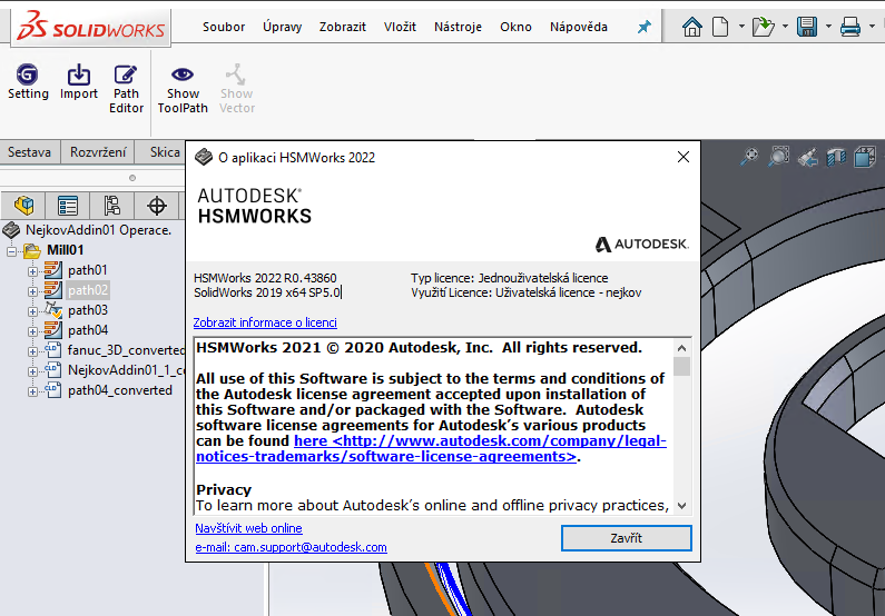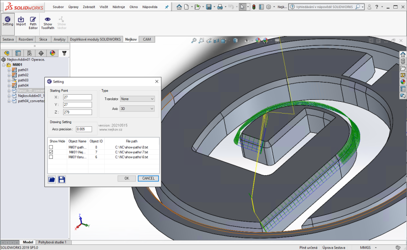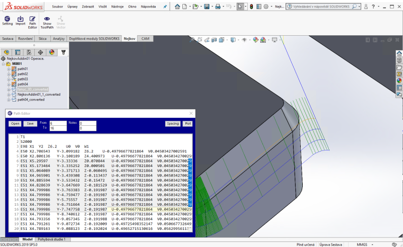 The superstructure includes a text editor for the tool paths and tools displaying the paths using OpenGL. We developed NejkovAddin due to the need to generate more accurate paths for certain part geometries, better collaboration with external programmers and to keep the HSMWorks system for our production. This allows machine operators to simulate paths for 5-axis continuous machining created by higher end CAM systems directly in the HSMWorks environment and generate them with our debugged post-processors.